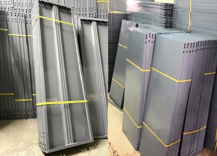 Mâm tole là tấm thép được gia công theo kích thước, đặt trực tiếp lên khung kệ sắt V lỗ, thường được sơn tĩnh điện.